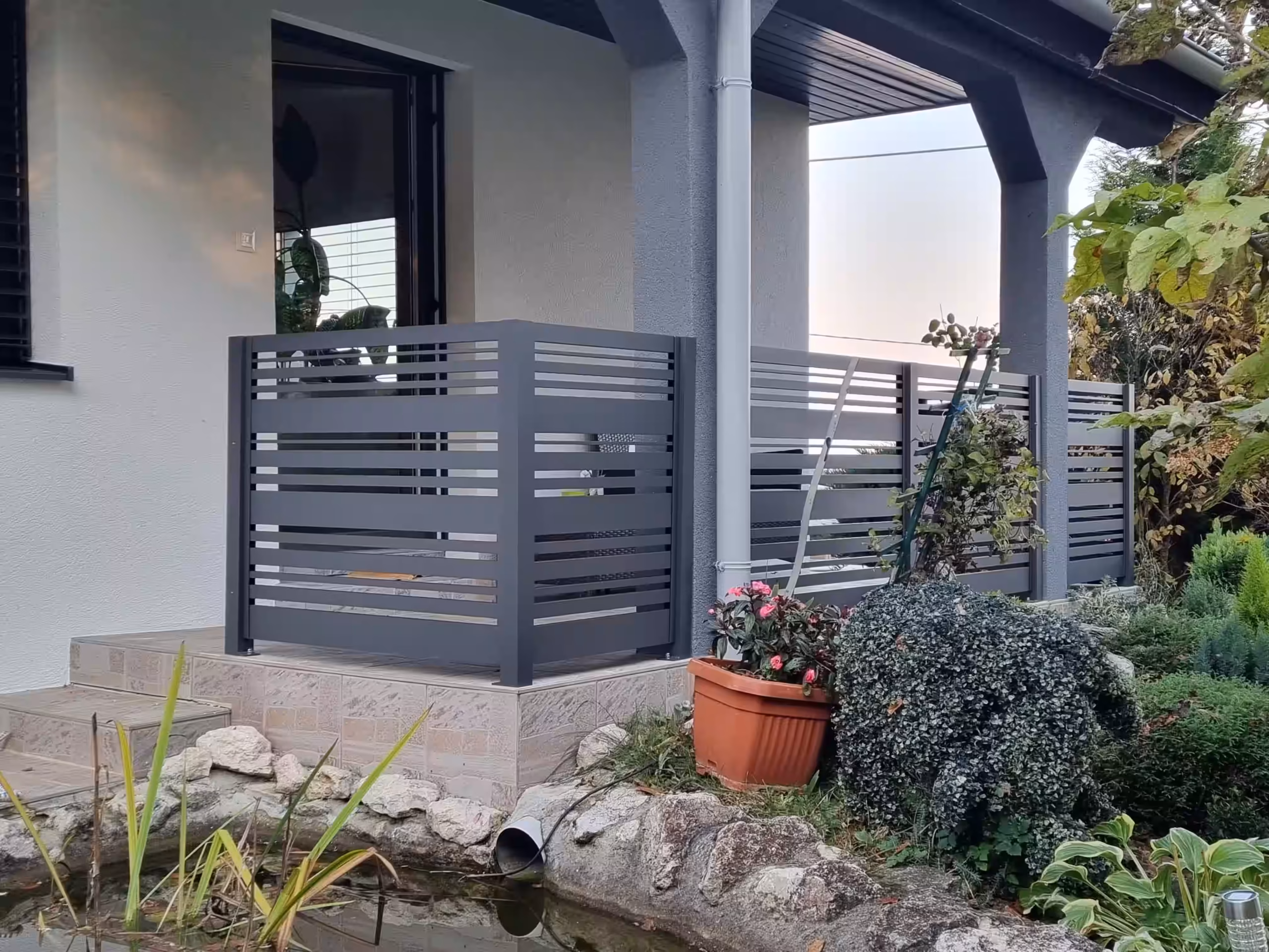 Konstrukcija iz kakovostnega aluminija je odporna proti koroziji in vremenskim vplivom, zato ograja ne zahteva zahtevnega vzdrževanja in ohranja stabilnost skozi leta.