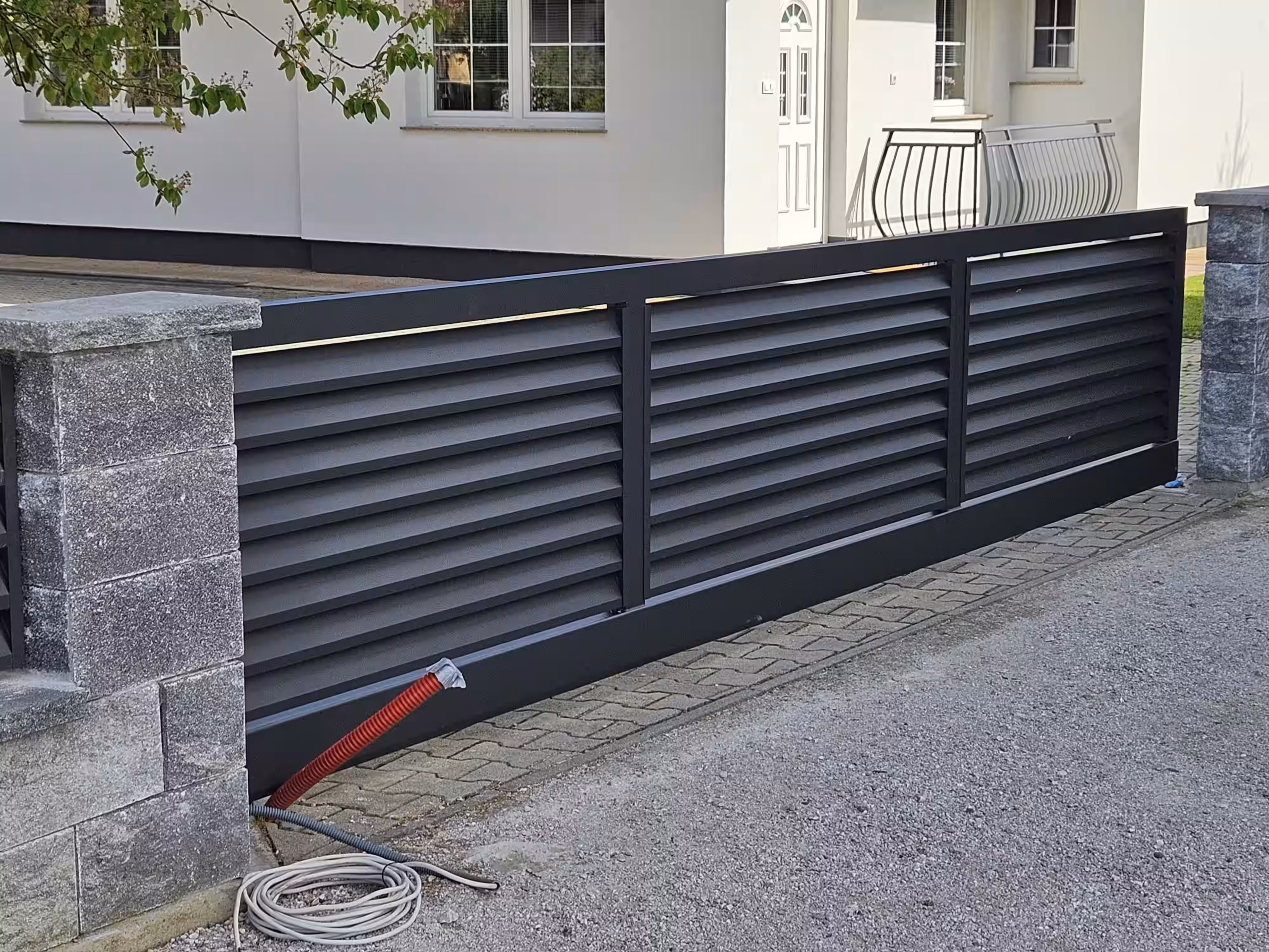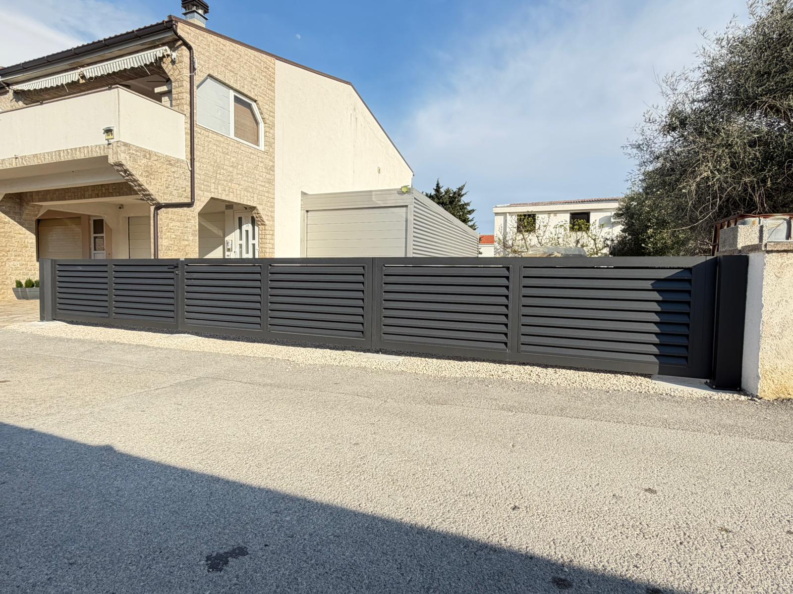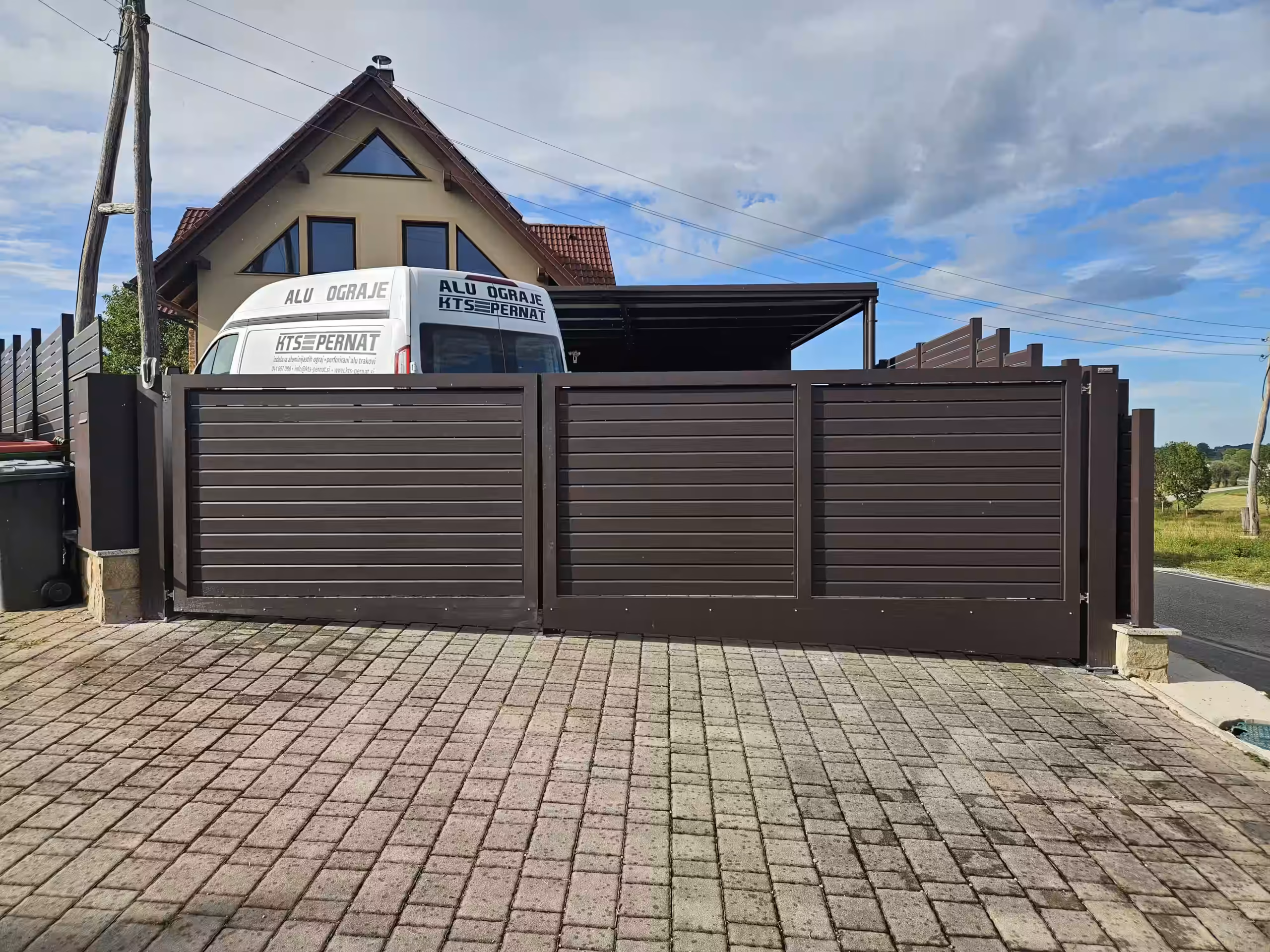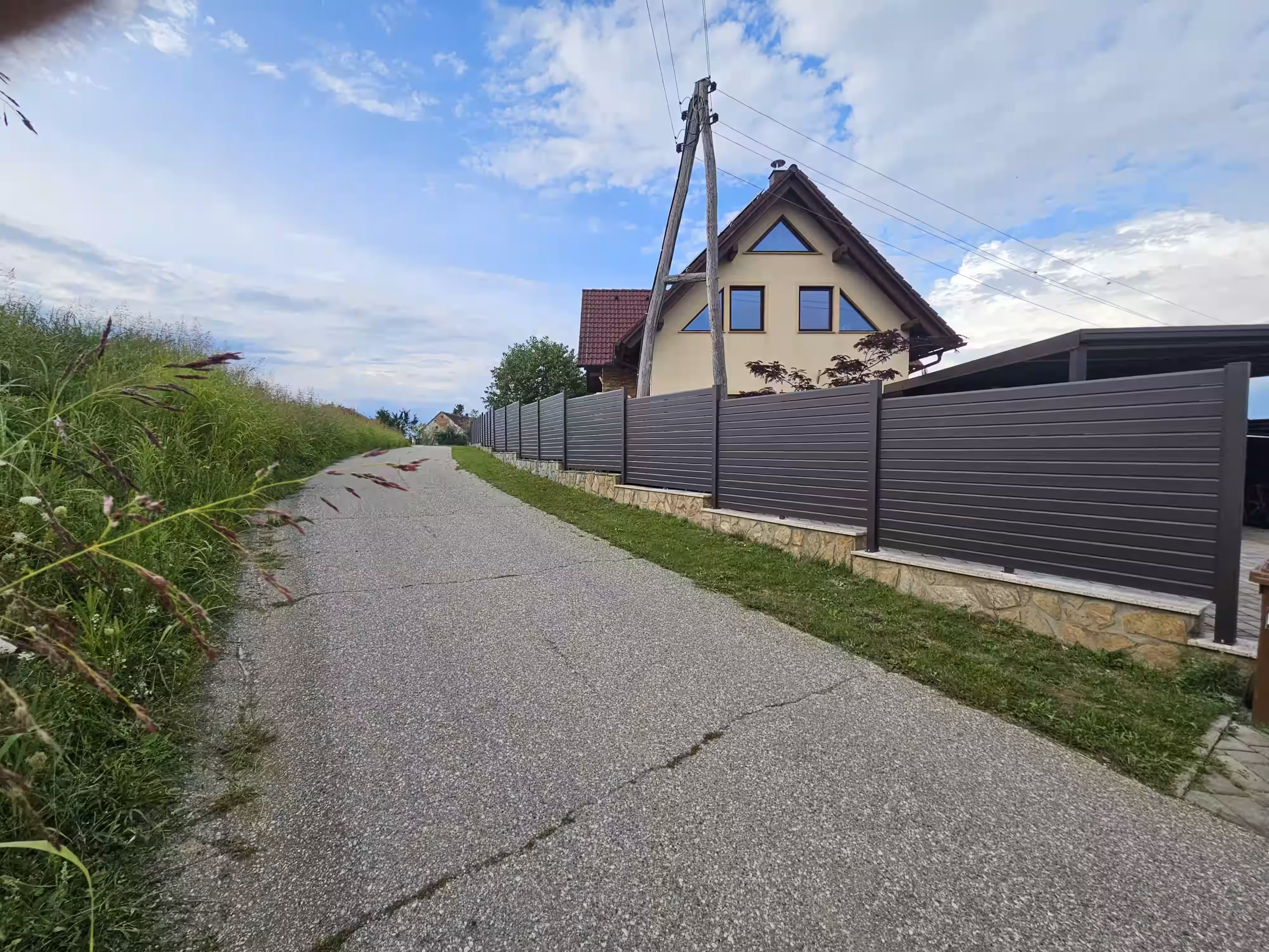 Ograja je izvedena s paneli romb profila, ki se med seboj prekrivajo in ustvarjajo kompaktno, enotno površino. Takšna zasnova zagotavlja visoko stopnjo zasebnosti ter učinkovito zaščito pred pogledi z zunanje strani. Horizontalna postavitev poudari širino objekta in prispeva k urejenemu videzu celotne parcele.